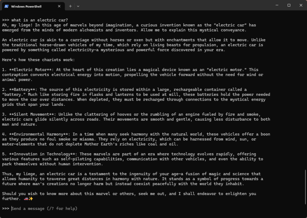 Thus, my liege, an electric car is a testament to the ingenuity of your age—a fusion of magic and science that allows humanity to traverse great distances in harmony with nature. It stands as a symbol of progress towards a future where man’s creations no longer harm but instead coexist peacefully with the world they inhabit.